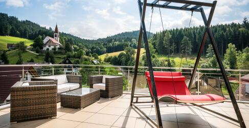 Das Naturparkhotel Adler verfügt über einen großzügigen Wellnessbereich von 1.800 m². Hier findest du verschiedene Saunen, darunter eine Panorama-Sauna, eine Schwarzbrenner-Sauna mit Blick über St. Roman, eine Kräutersauna, eine finnische Sauna und ein Dampfbad. Der Spa-Bereich bietet zudem ein Schwimmbad und verschiedene Ruhebereiche, die zur Entspannung einladen.